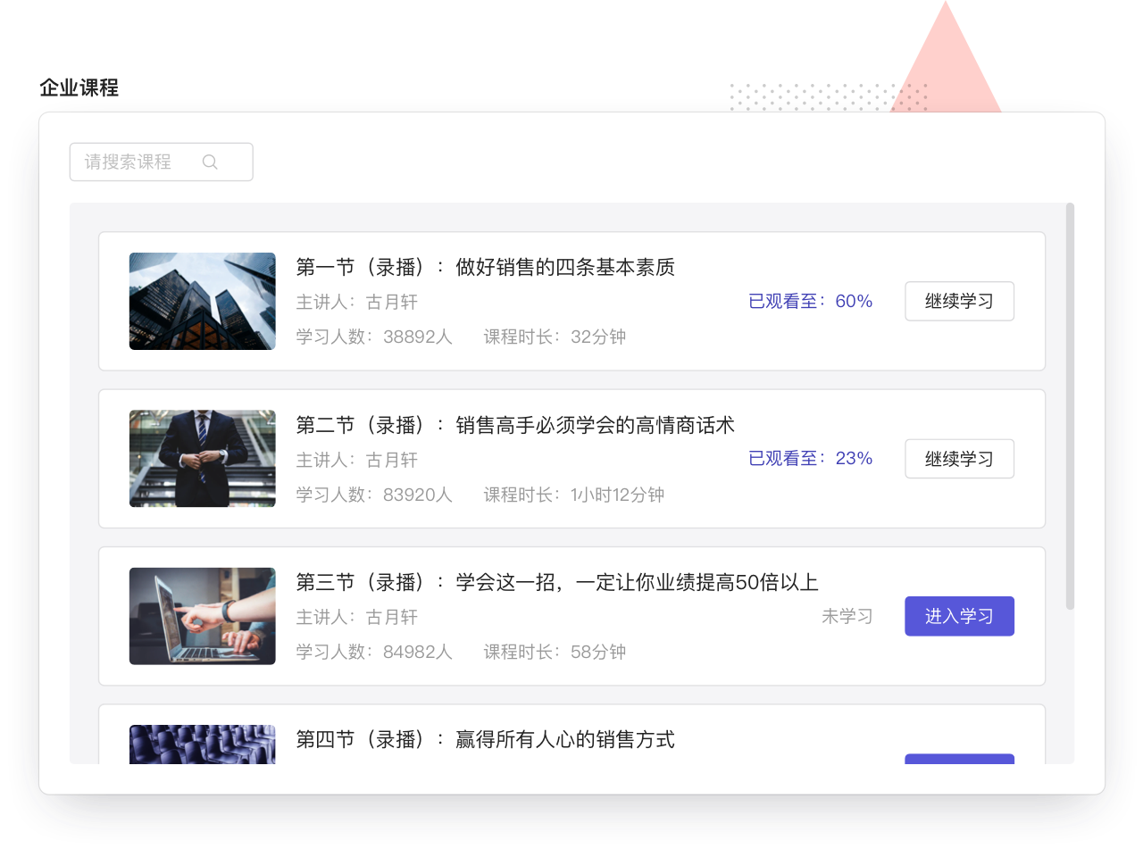 为企业量身提供销售能力培训。员工可以根据自己的能力模型,寻找相应课程,提升专业技能。学习促使组织不断成长!